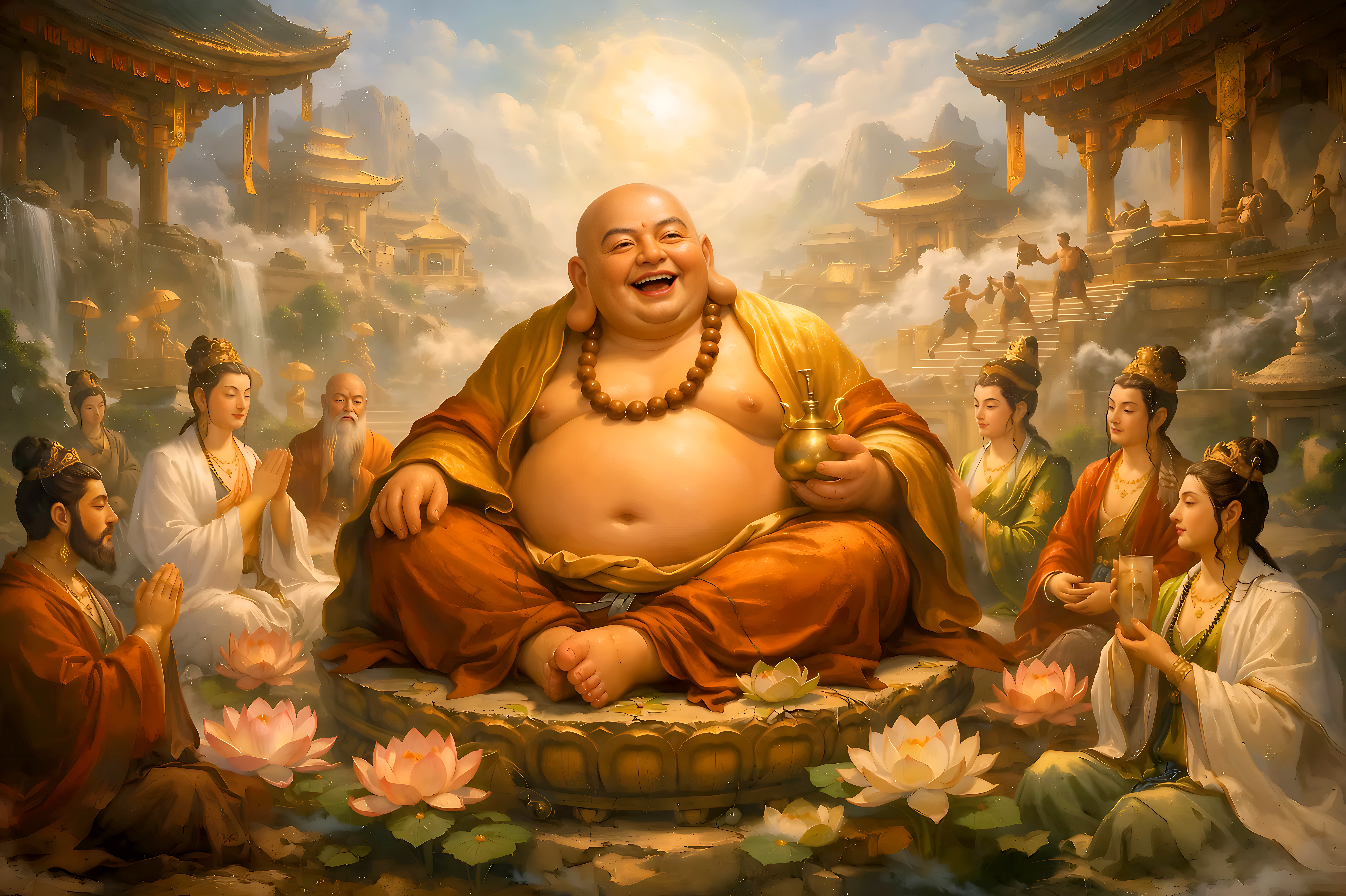 Lord Maitreya Buddha depicting as the avatar of Monk Budai and preaching to Bodhisattvas in Heaven realm.