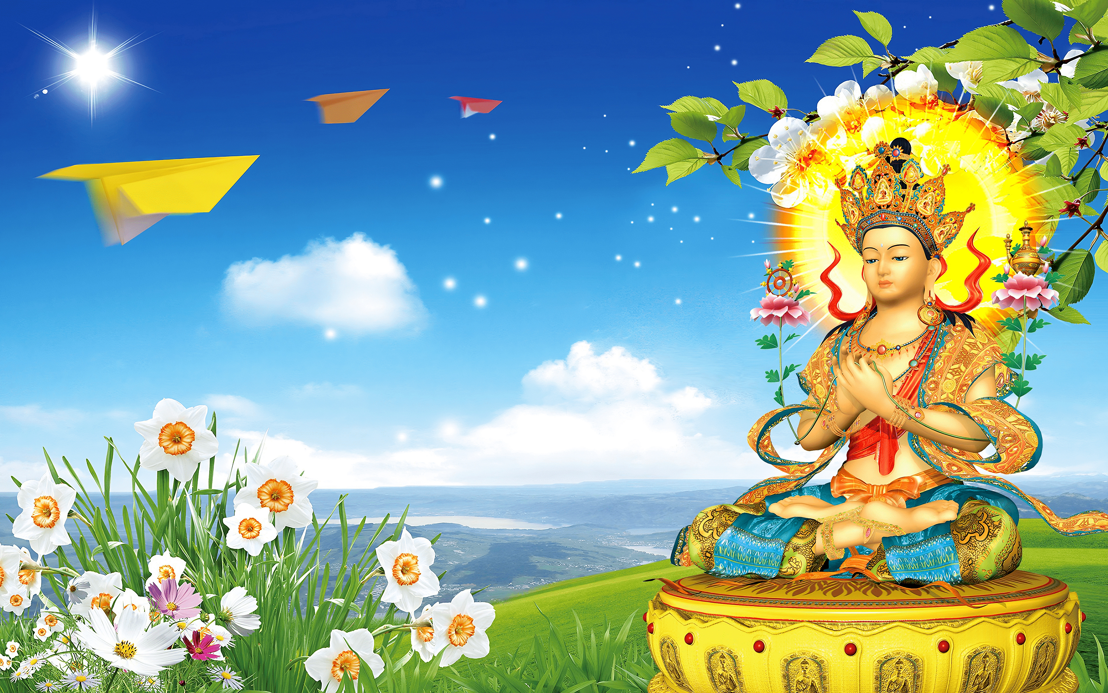 Lord Maitreya Buddha with White Apricot Blossom, Narcissus and Daisy Flowers.